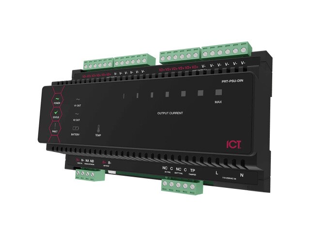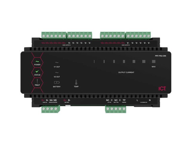 Deze intelligente voeding voor het ICT protege systeem heeft een uitgangsvermogen van 8A. Naast het 8A vermogen van de module kan er ook nog een back-up worden gekoppeld en geladen worden met 500mA. Op deze module bevinden zich 2 relais uitgangen die maximaal met 50mA belast kunnen worden.