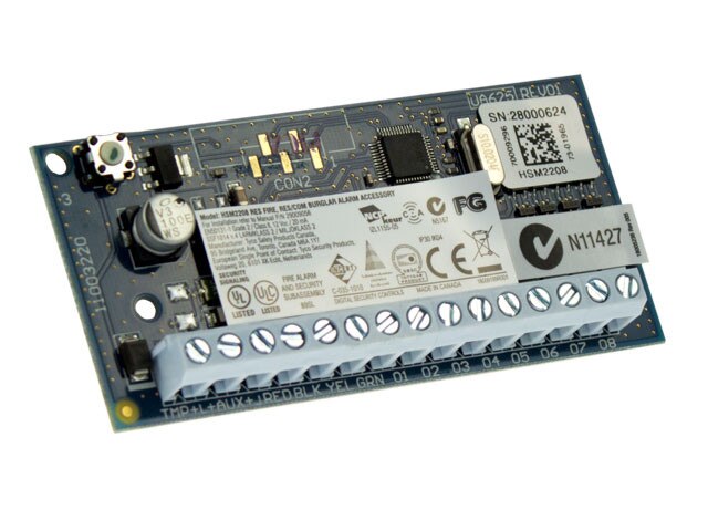 De HSM2208 is een bedrade uitgang uitbreidingsmodule die aangesloten wordt op de keybus van de centrale. Deze module is voorzien van 8 uitgangen die elk afzonderlijk een vermogen kunnen bieden van maximaal 50mA @ 12V DC.